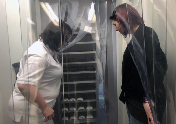- Mit csinálnak a levett plazmáddal? Hova kerül, mielőtt elszállíttatnák? – A levett plazmát fagyasszák, és mielőtt elkerülne a gyárba feldolgozásra előtte különböző vírusokra vizsgálják. A fenti részről a levett plazmát óránként viszik a lent található hatalmas hűtőkonténerbe, ami két részre van kialakítva. Egyszer -40 fokon mélyfagyasztják a plazmát, majd utána átkerülnek a -25 fokos raktárrészbe. Itt is kétfelé raktározzák a plazmát. Egyik oldalt a még visszaigazolásra váró plazmák találhatóak, míg másik oldalt már a szállításra alkalmasak, melyekről a visszaigazolás megérkezett, hogy rendben van.